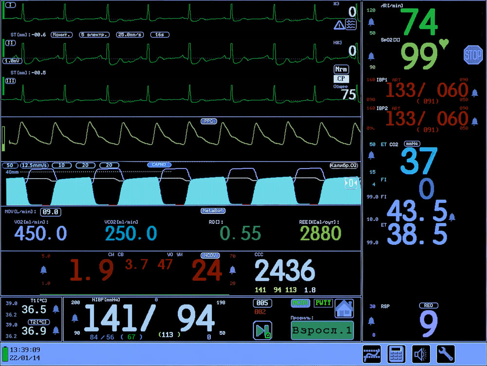 Реанимационный монитор МПР6-03 Комплектация Р1.24 эксплуатируется в ПИТ, ОРИТ и предназначен для наблюдения за основными параметрами жизнедеятельности пациента:
